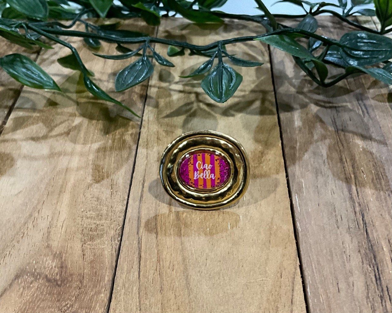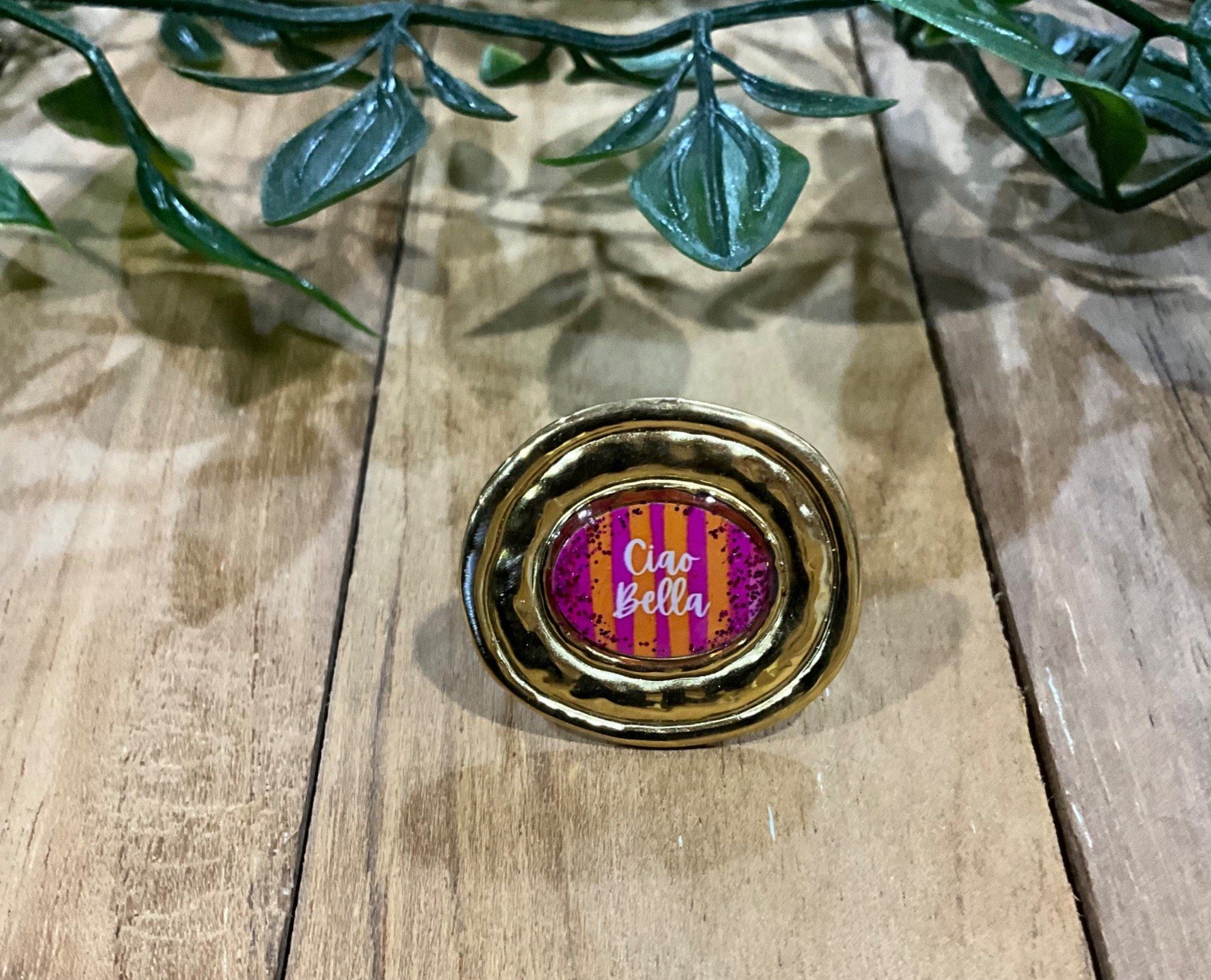 Bague ovale réglable en acier doré et résine .