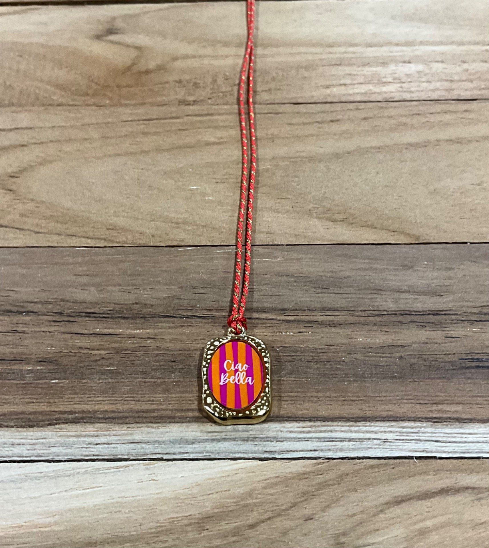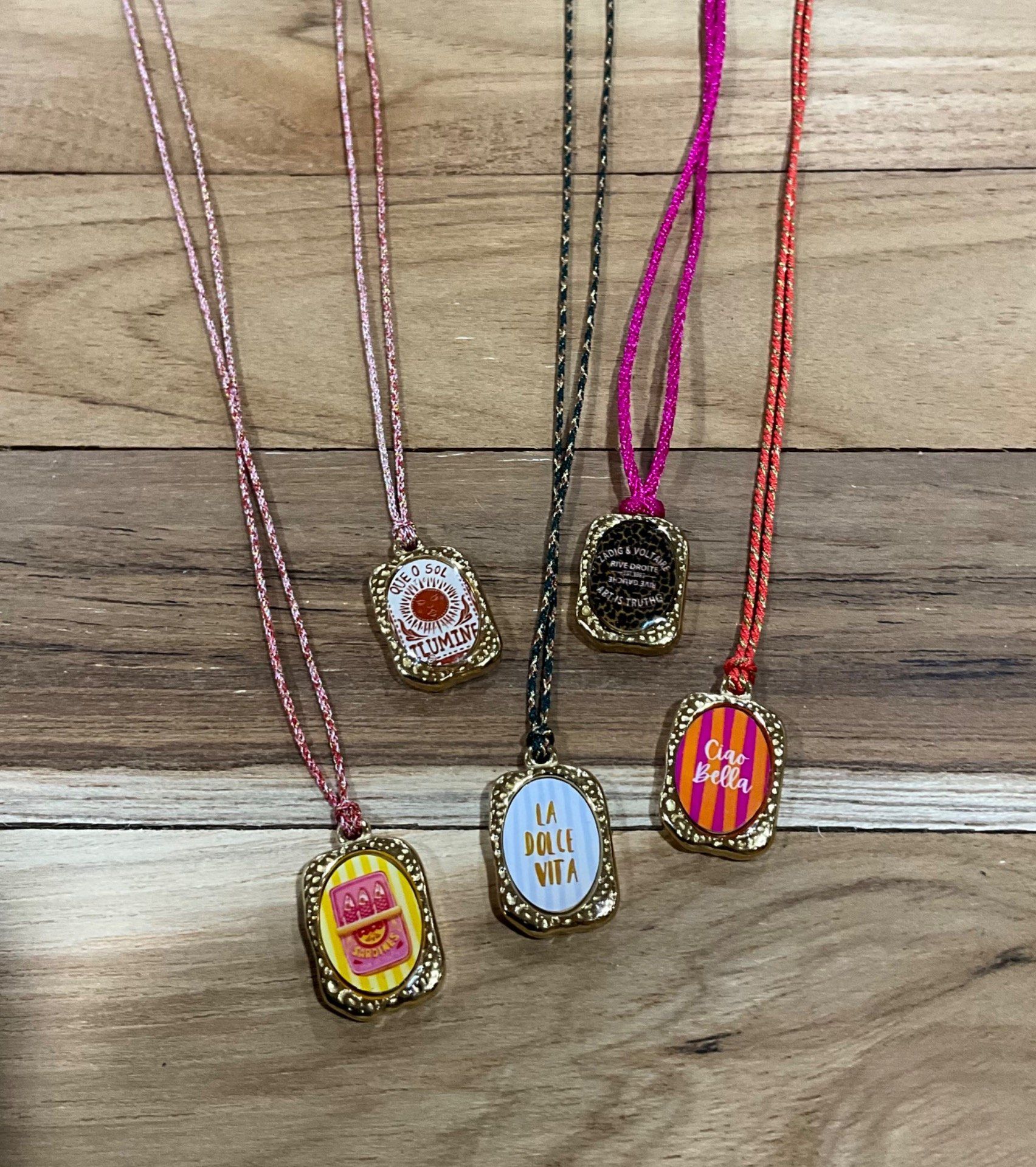 Collier monté sur fil réglable, pendentif en acier doré et résine.