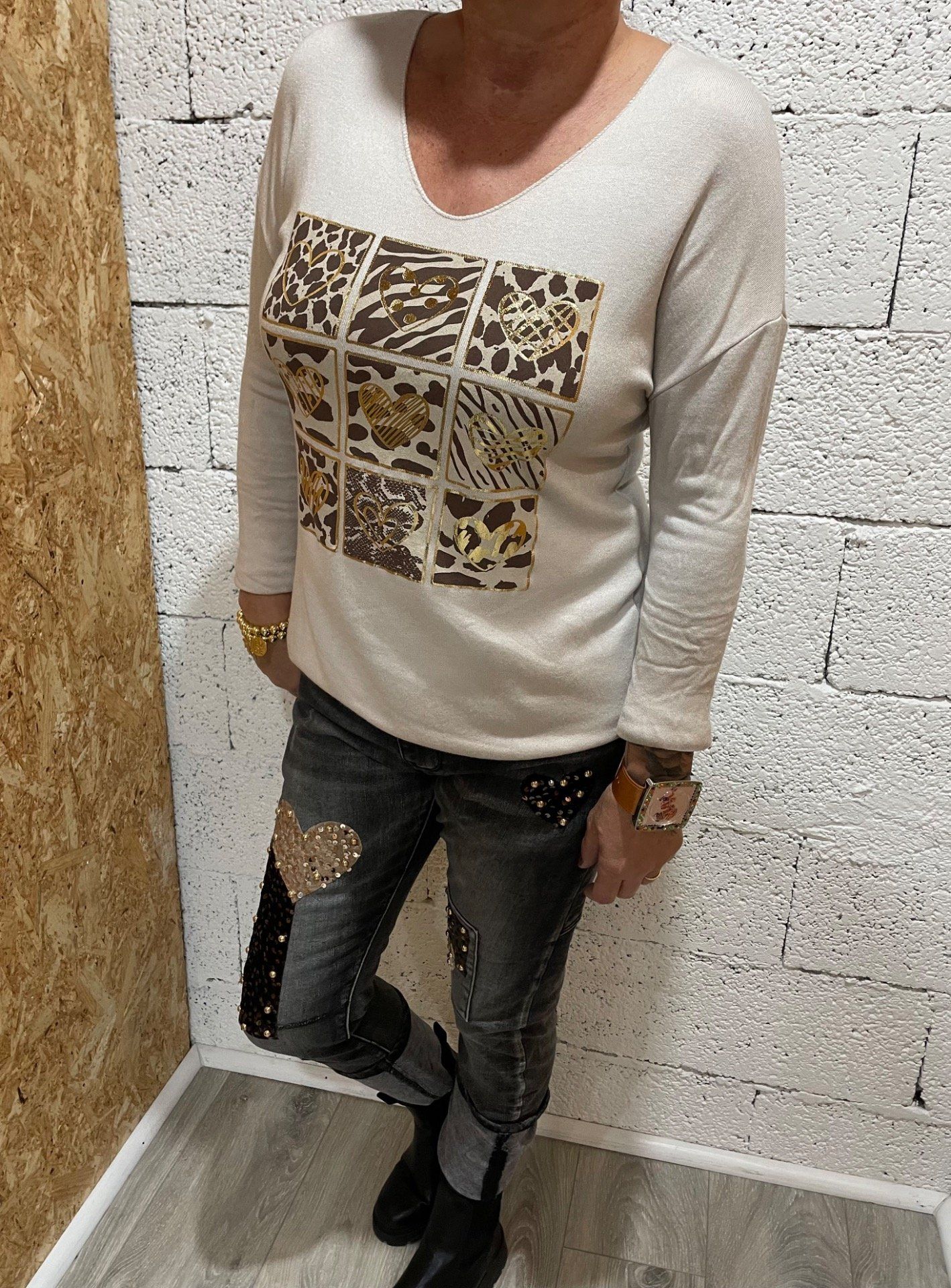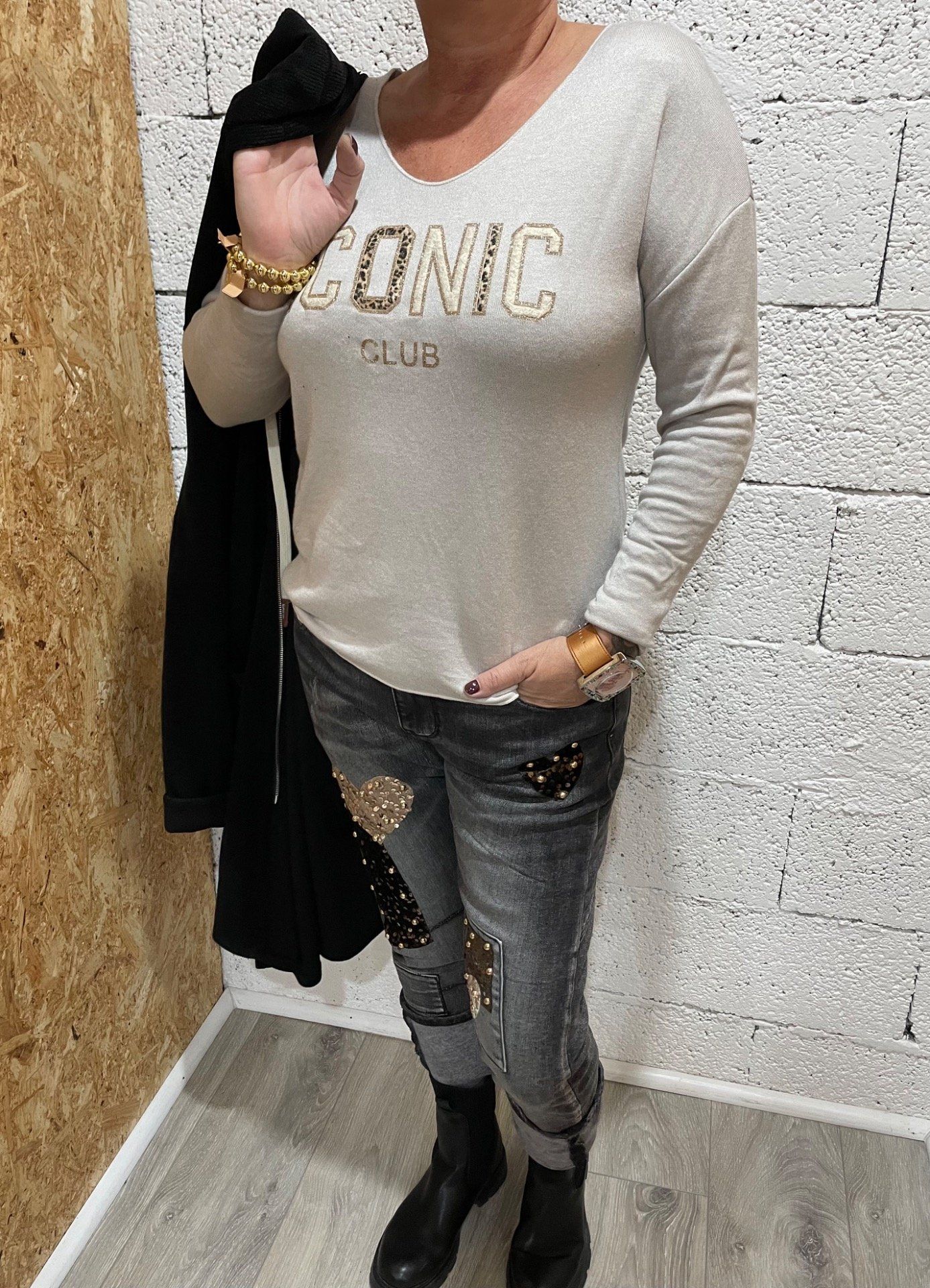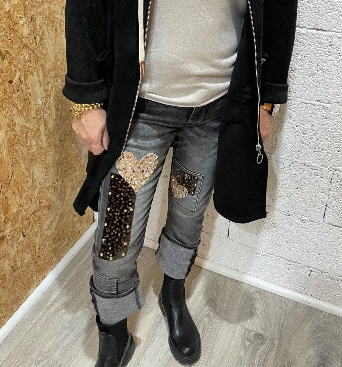 Jean boyfriend noir et gris , paillettes en forme de cœur, effet usé , fermeture bouton et zip.