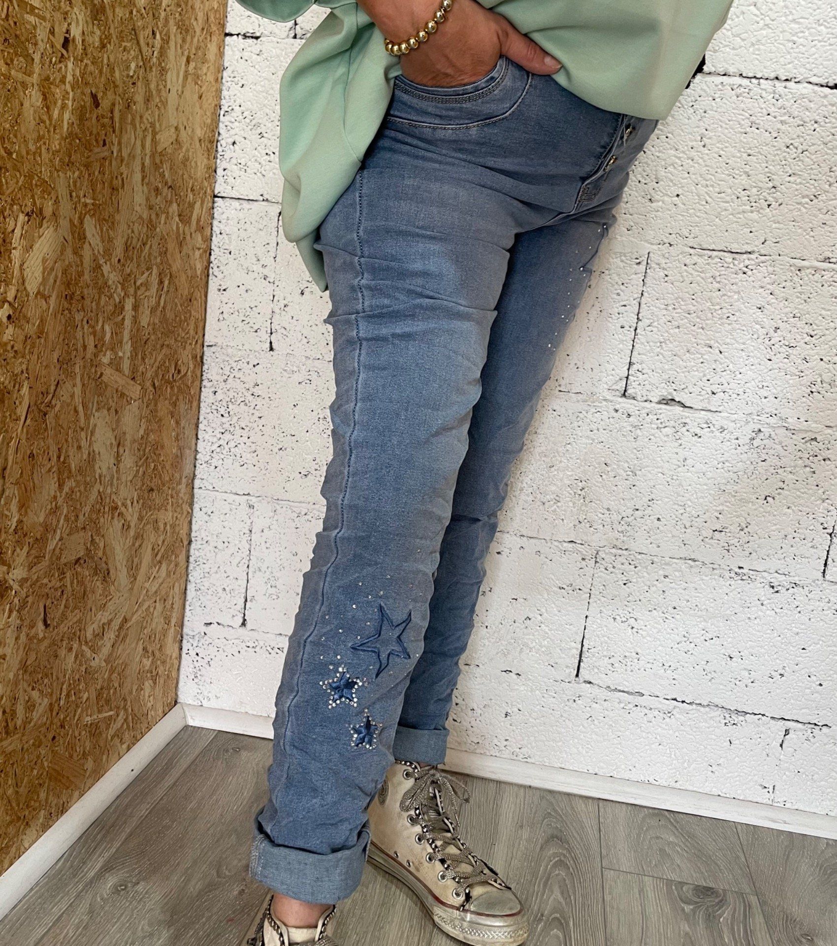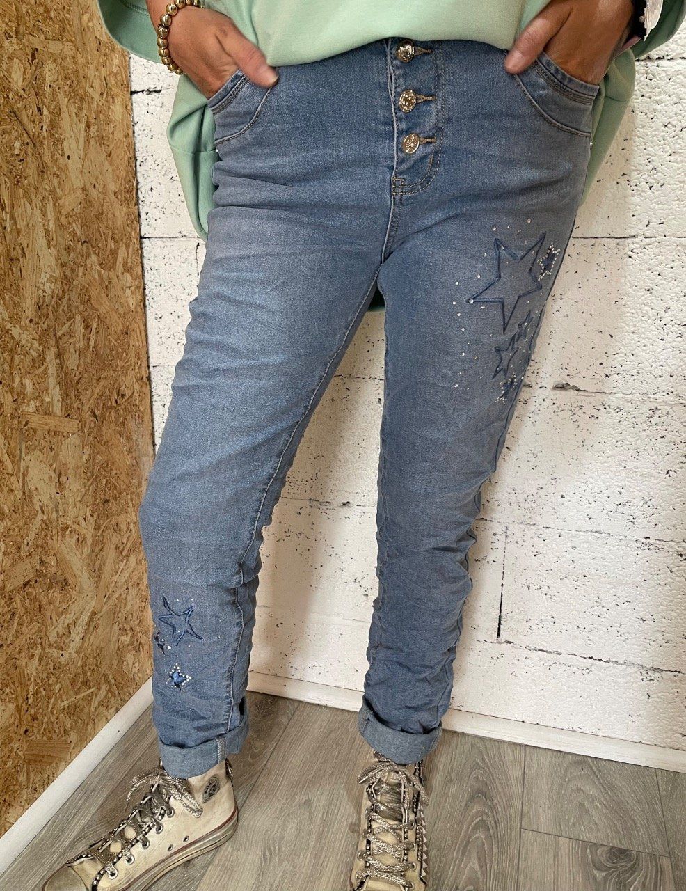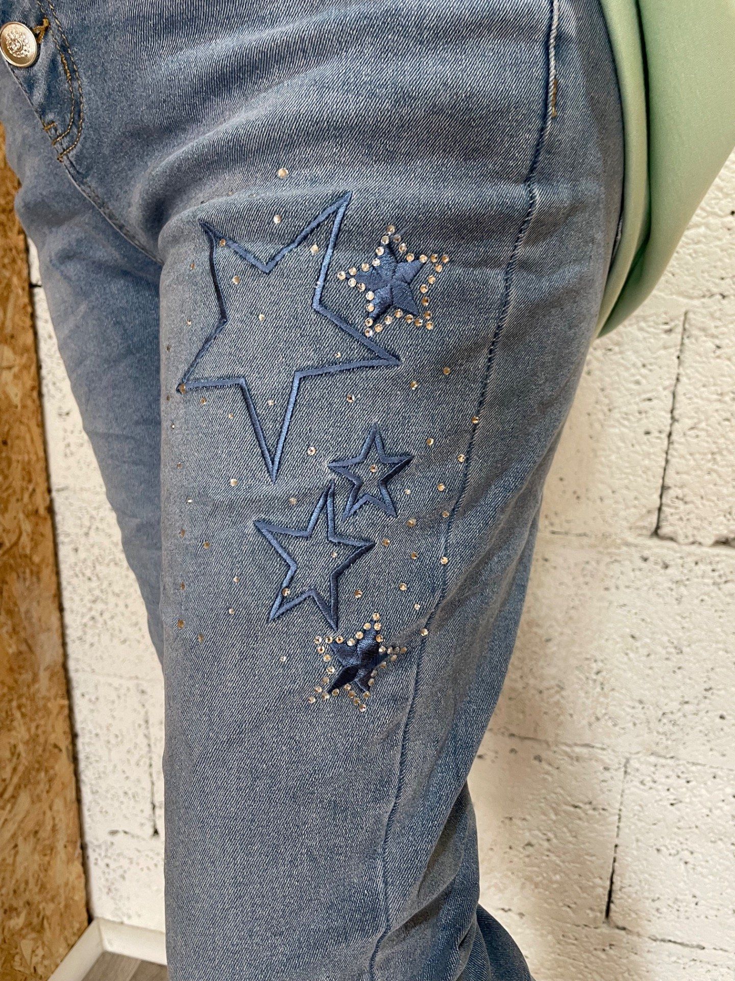 Jean karostar , motifs étoiles avec strass décoratifs , fermeture boutons, poches avant et arrière.