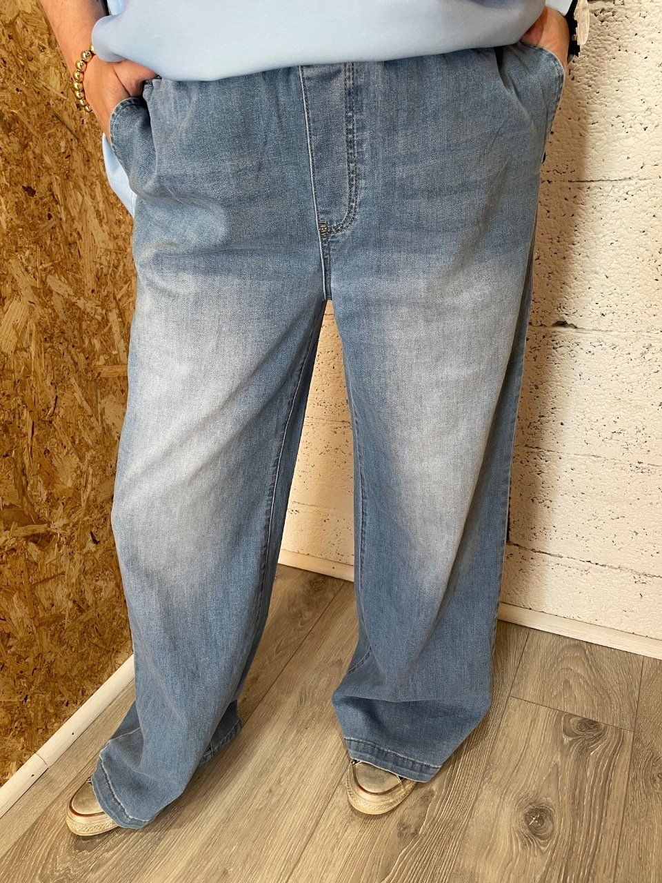Jean coupe large , taille élastique , deux poches côté.
