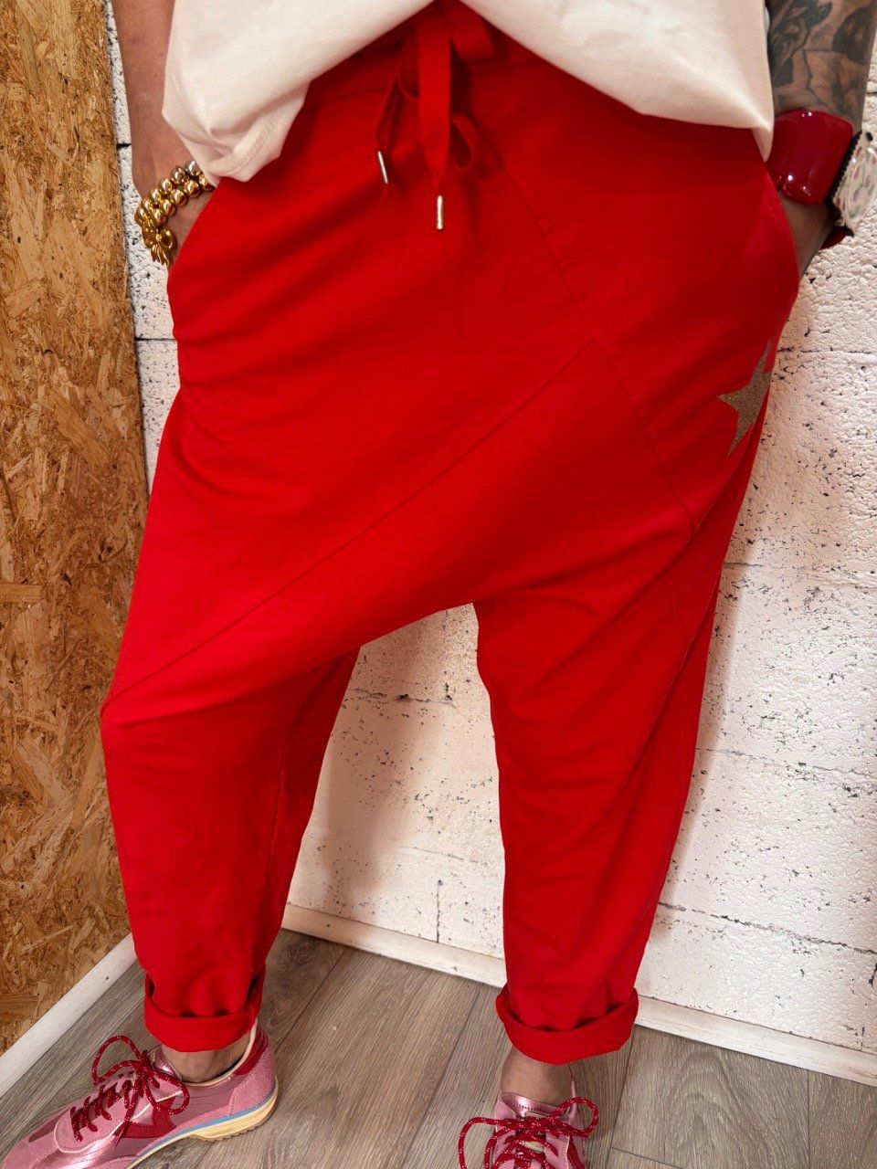 Jogg taille élastique avec cordon , coupe sarouel , deux poches côté , étoile strass devant, deux poches plaquées derrière.