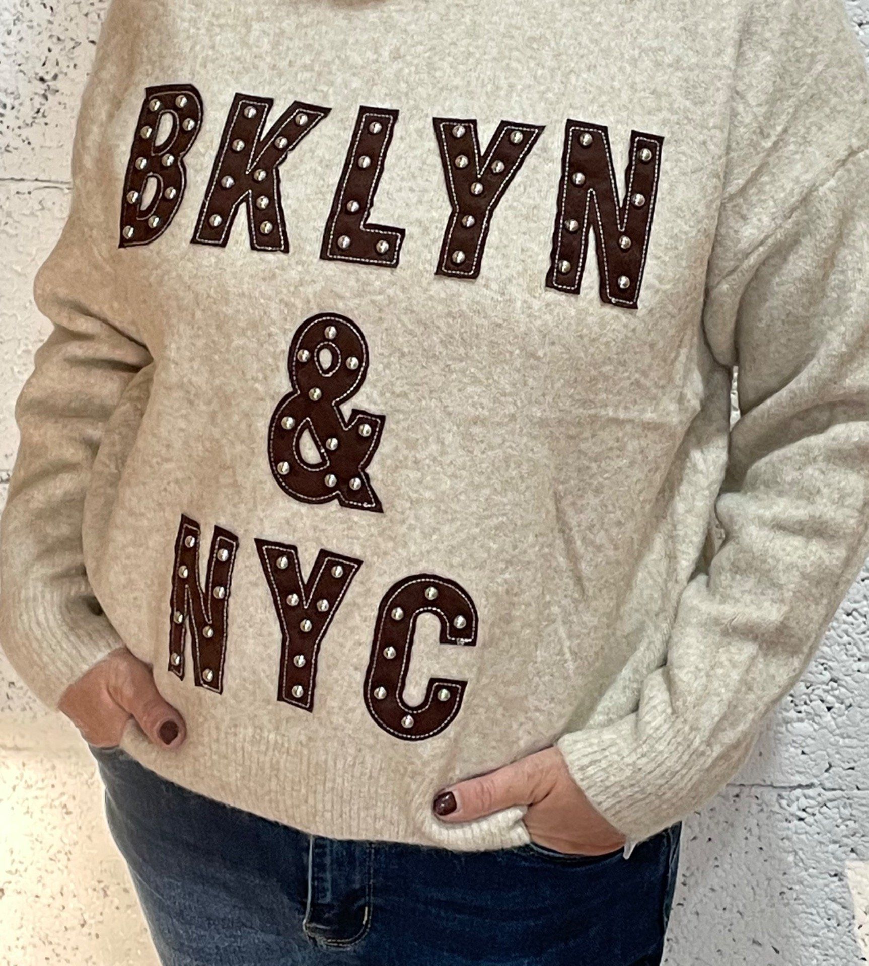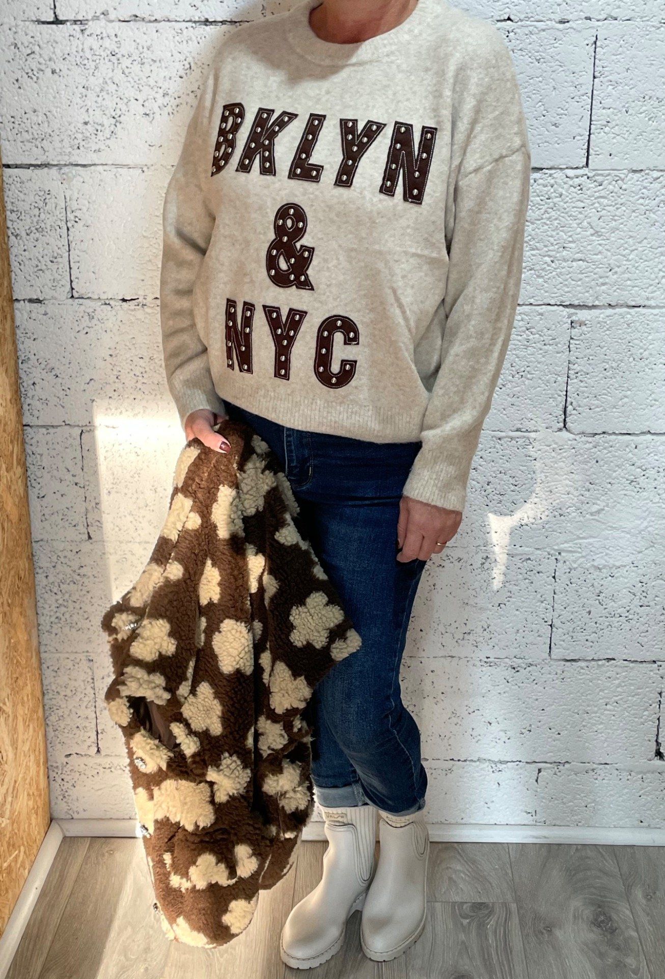Pull chaud , col arrondi, inscription avec clous devant , taille unique du 34 au 42.