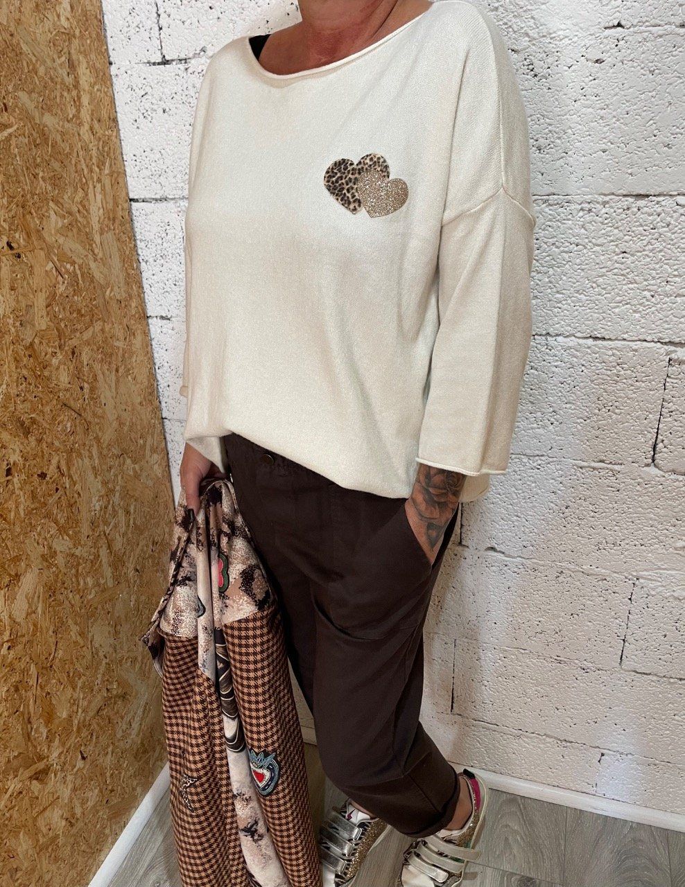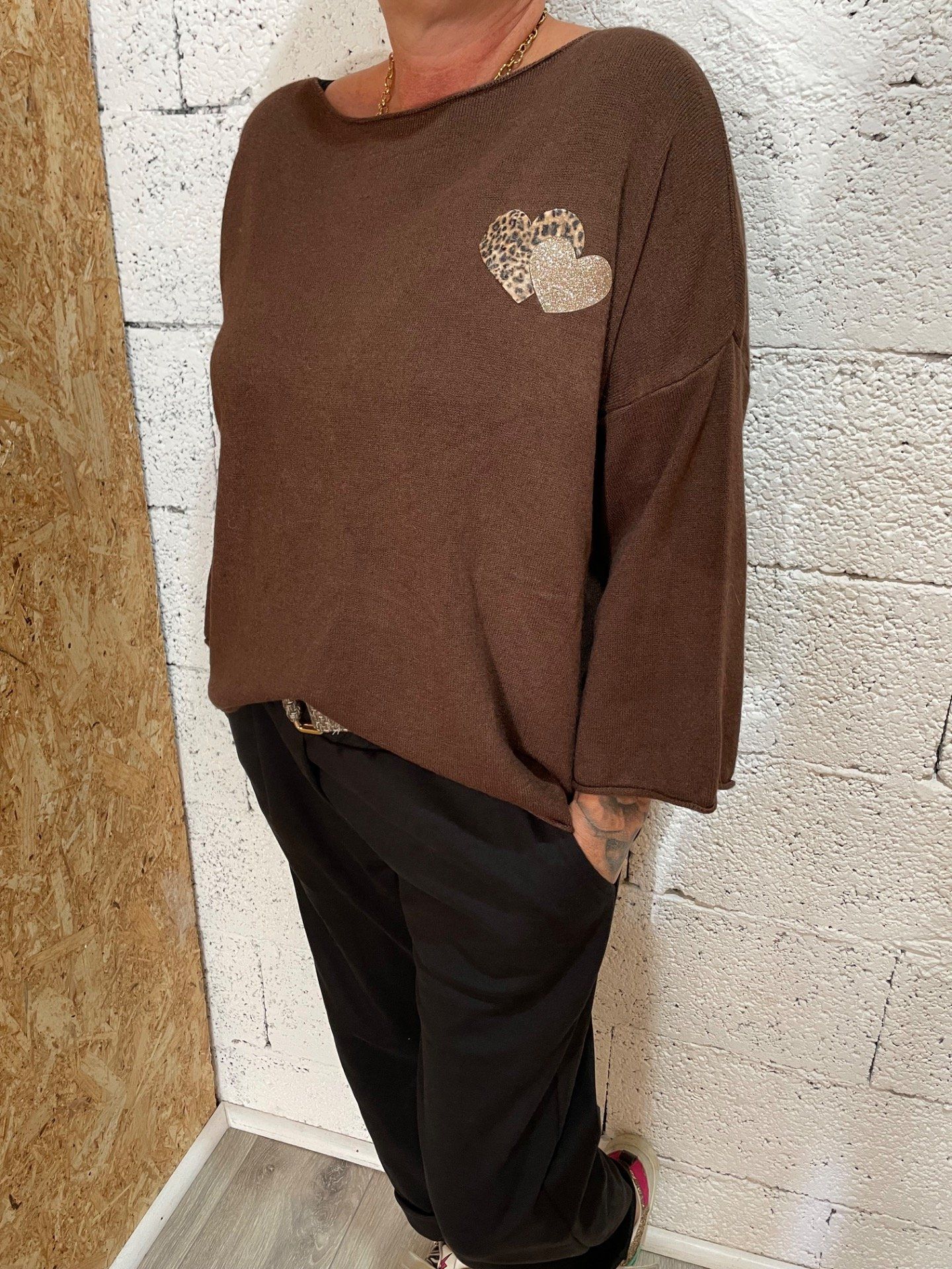 Pull tout doux col bateau, manches larges, deux cœurs sur la poitrine.
