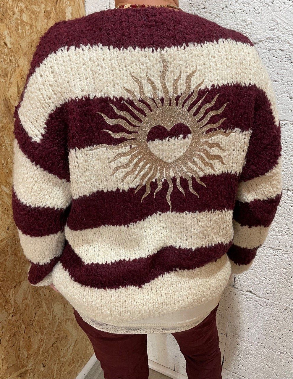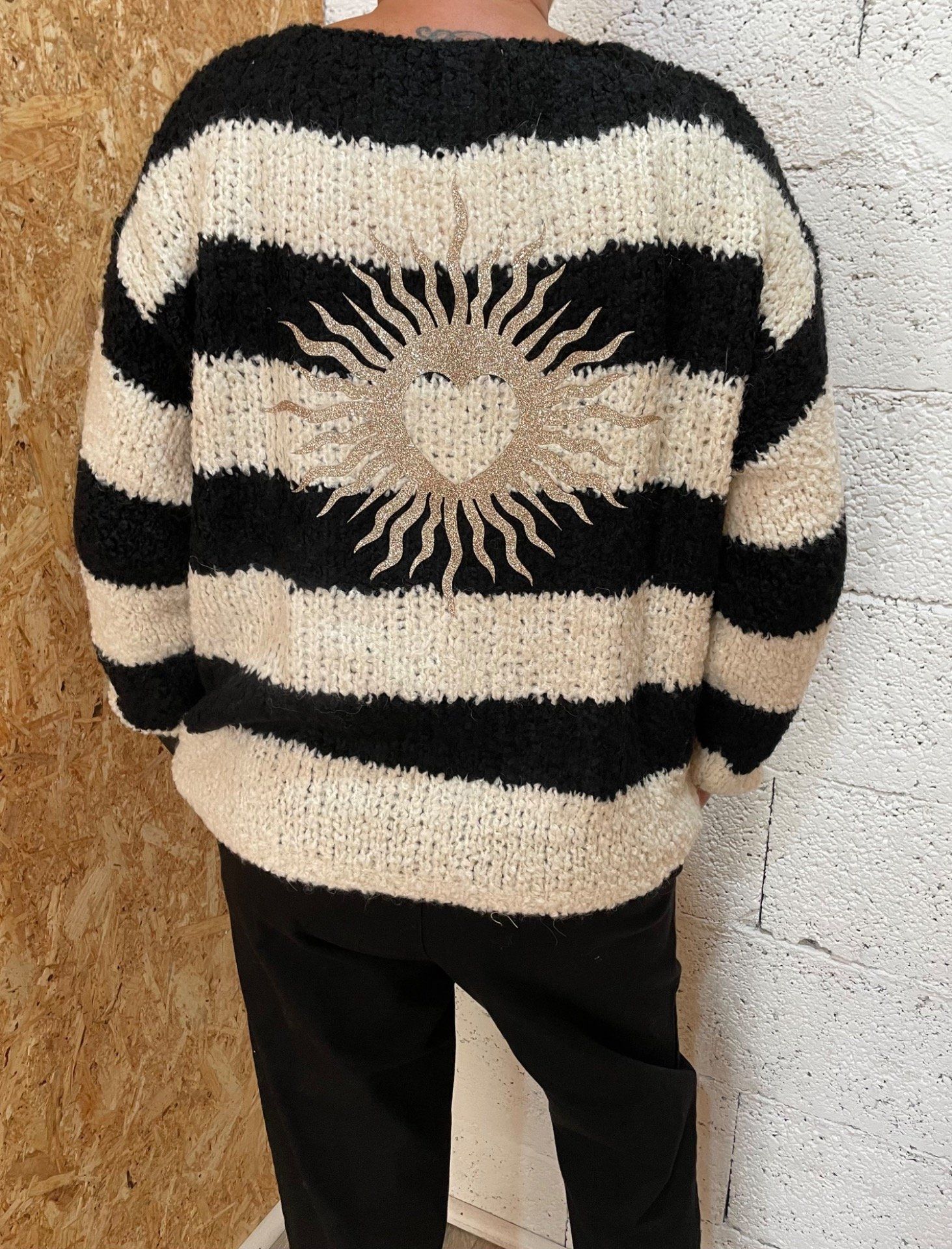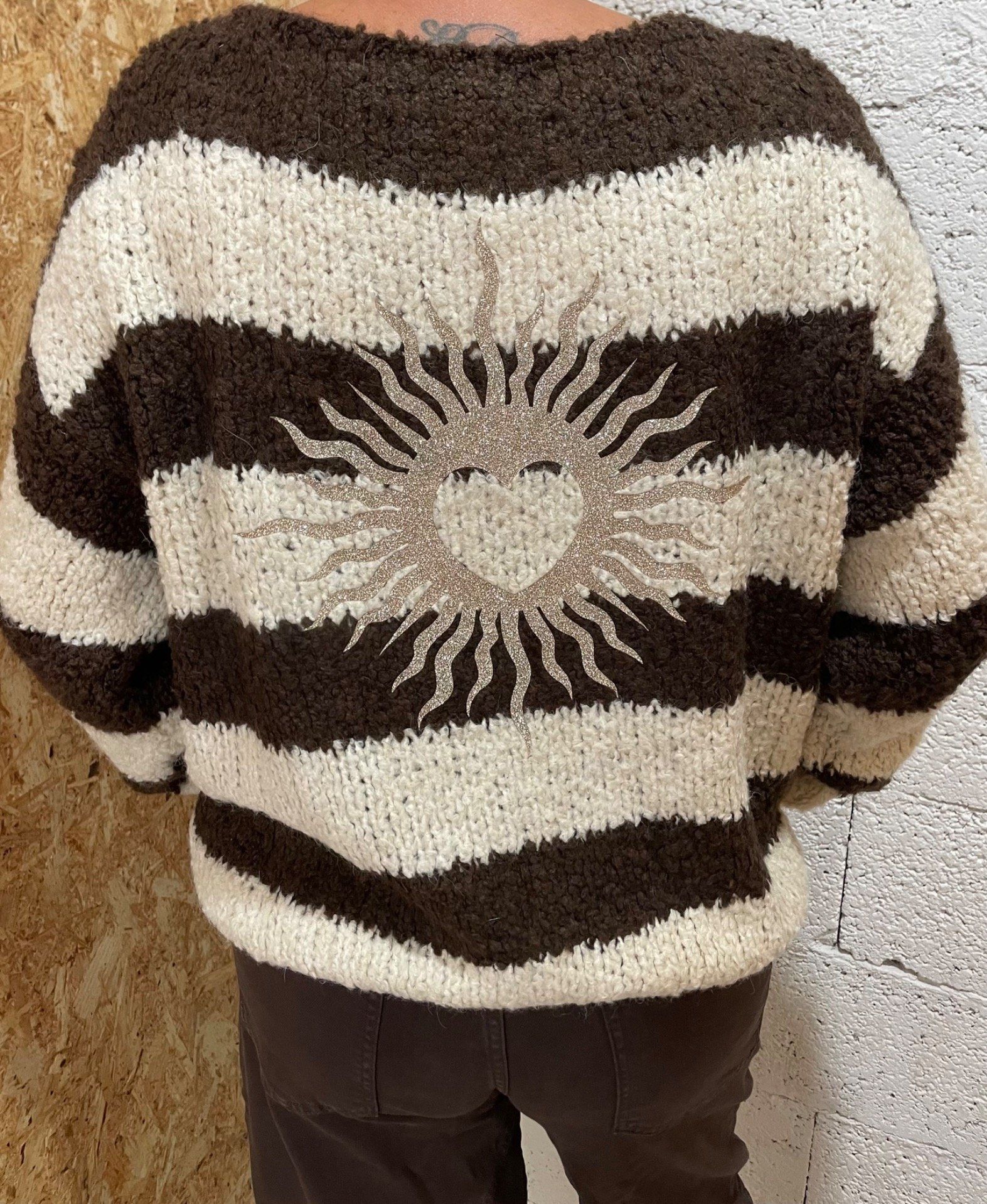 Pull rayé en maille bouclette , coupe loose , motif cœur soleil dans le dos ,