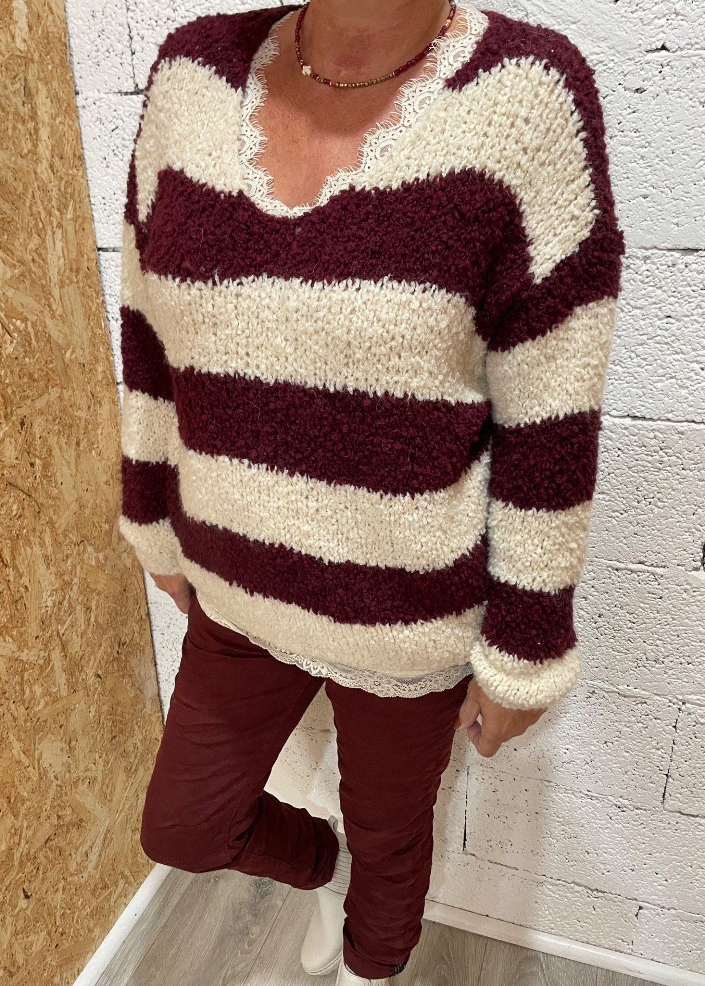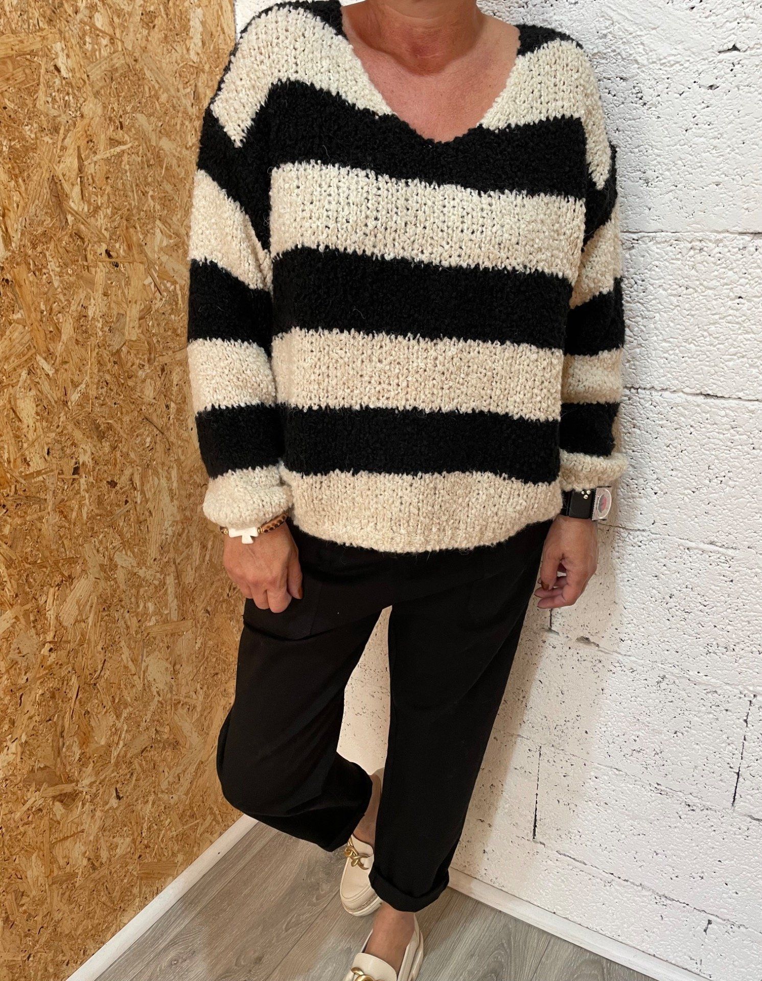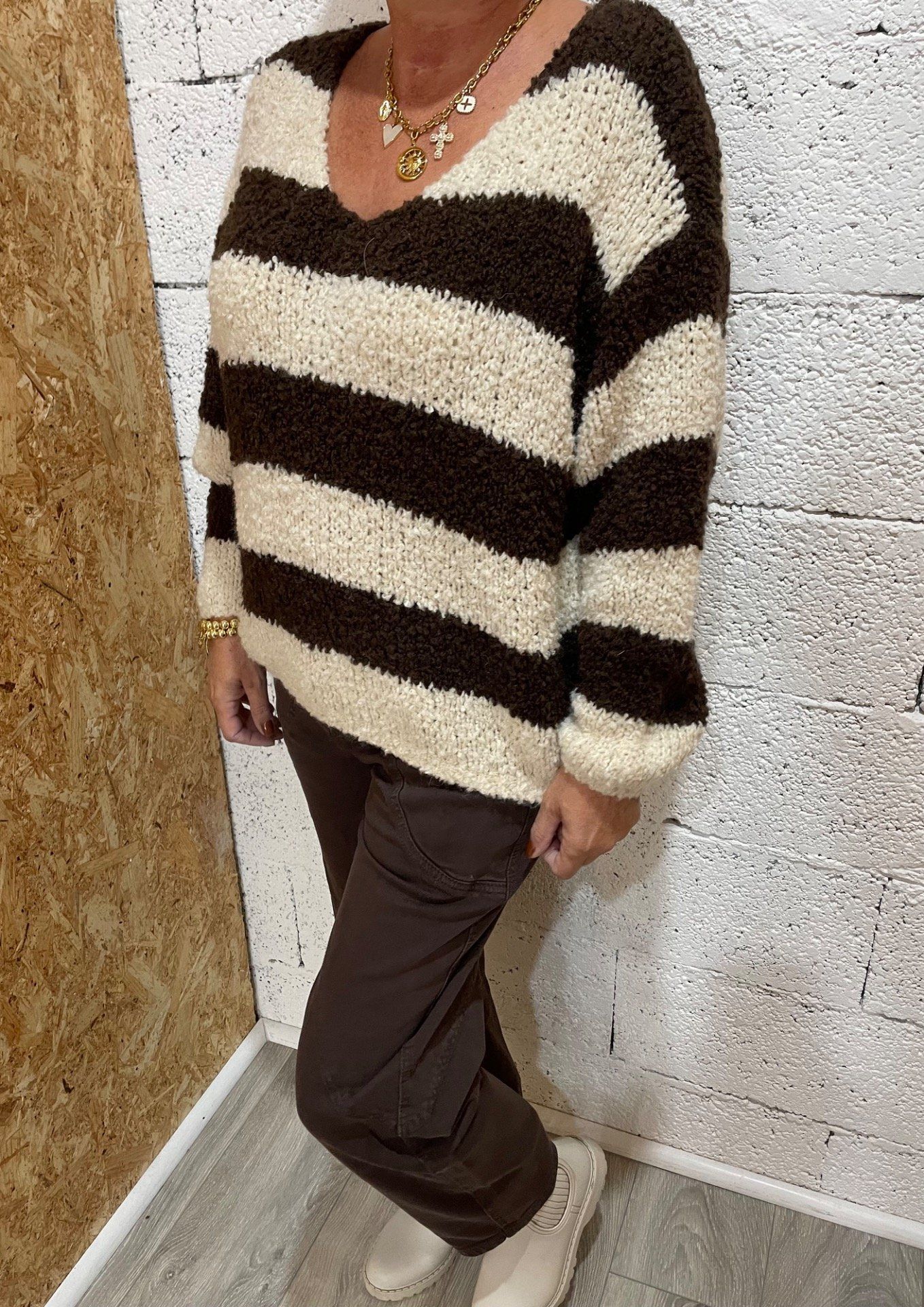 Pull rayé en maille bouclette , coupe loose , motif cœur soleil dans le dos ,