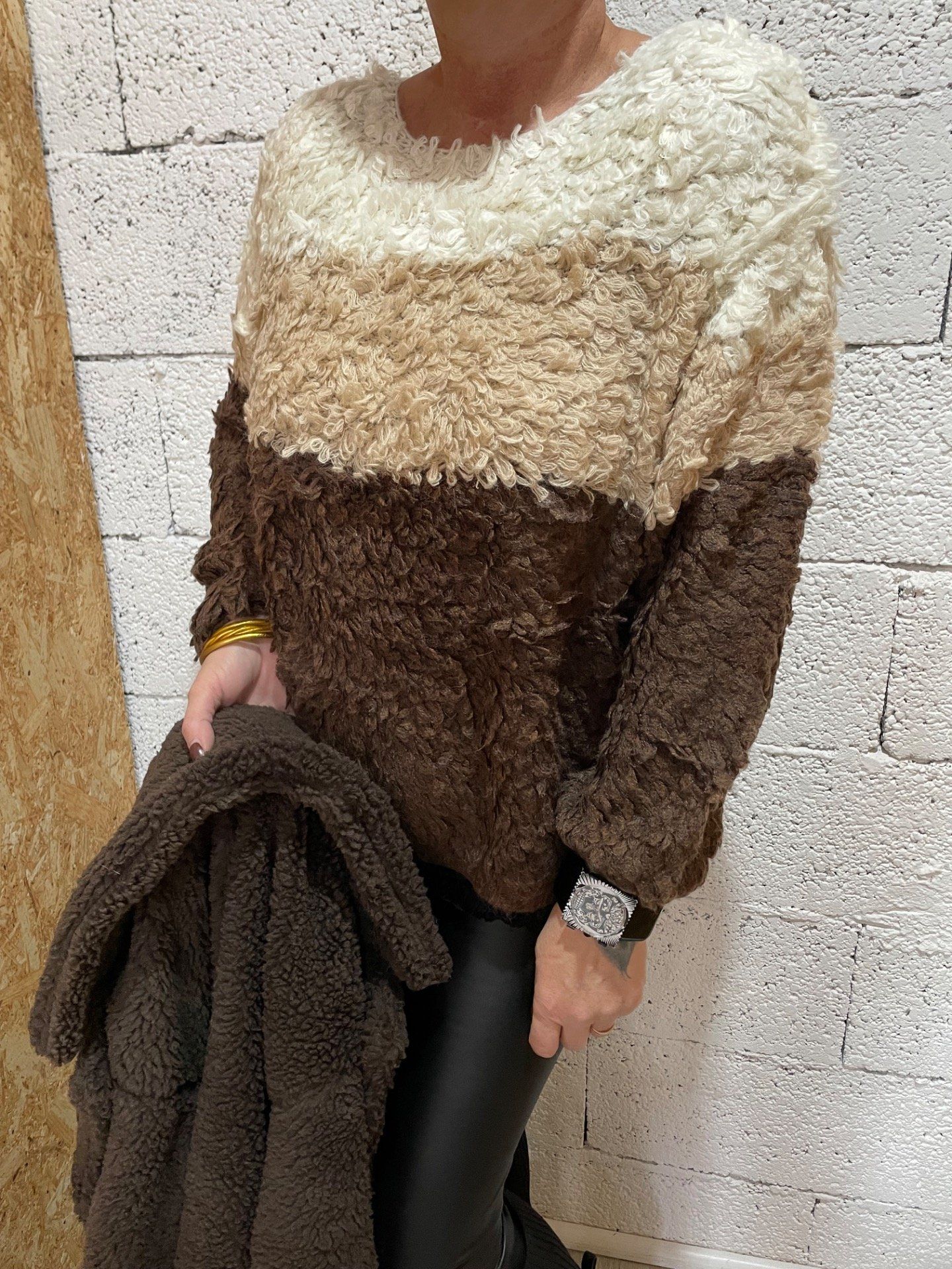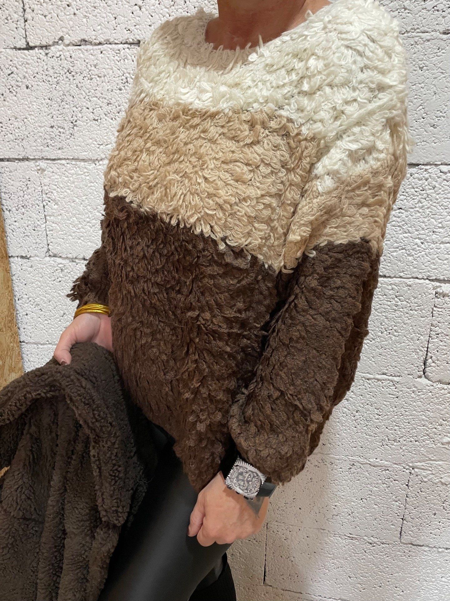 Pull maille bouclée, bandes tricolores , coupe légèrement ample ,