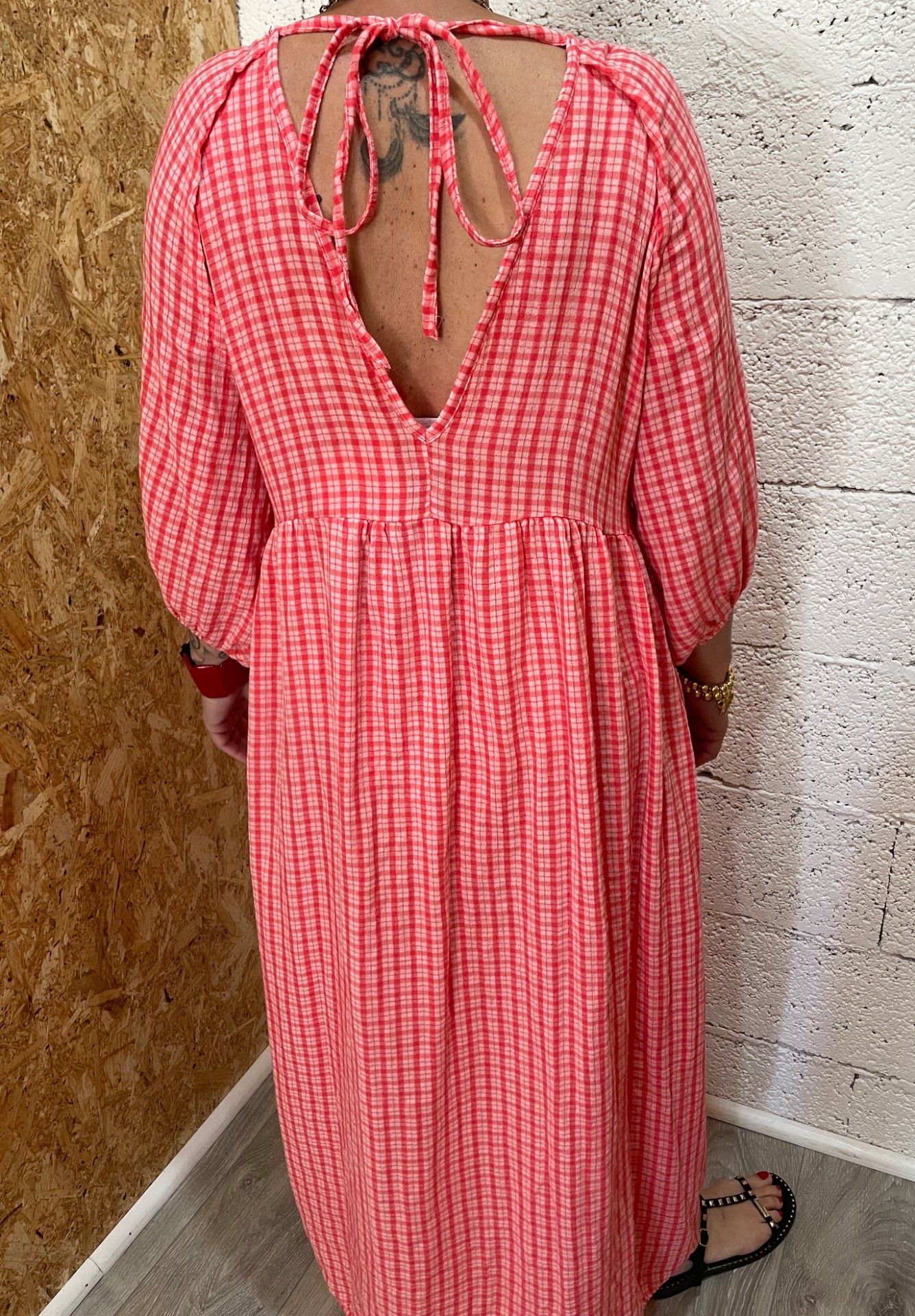 Robe longue à carreaux, manches 3/4 bouffantes , col en V devant et derrière.