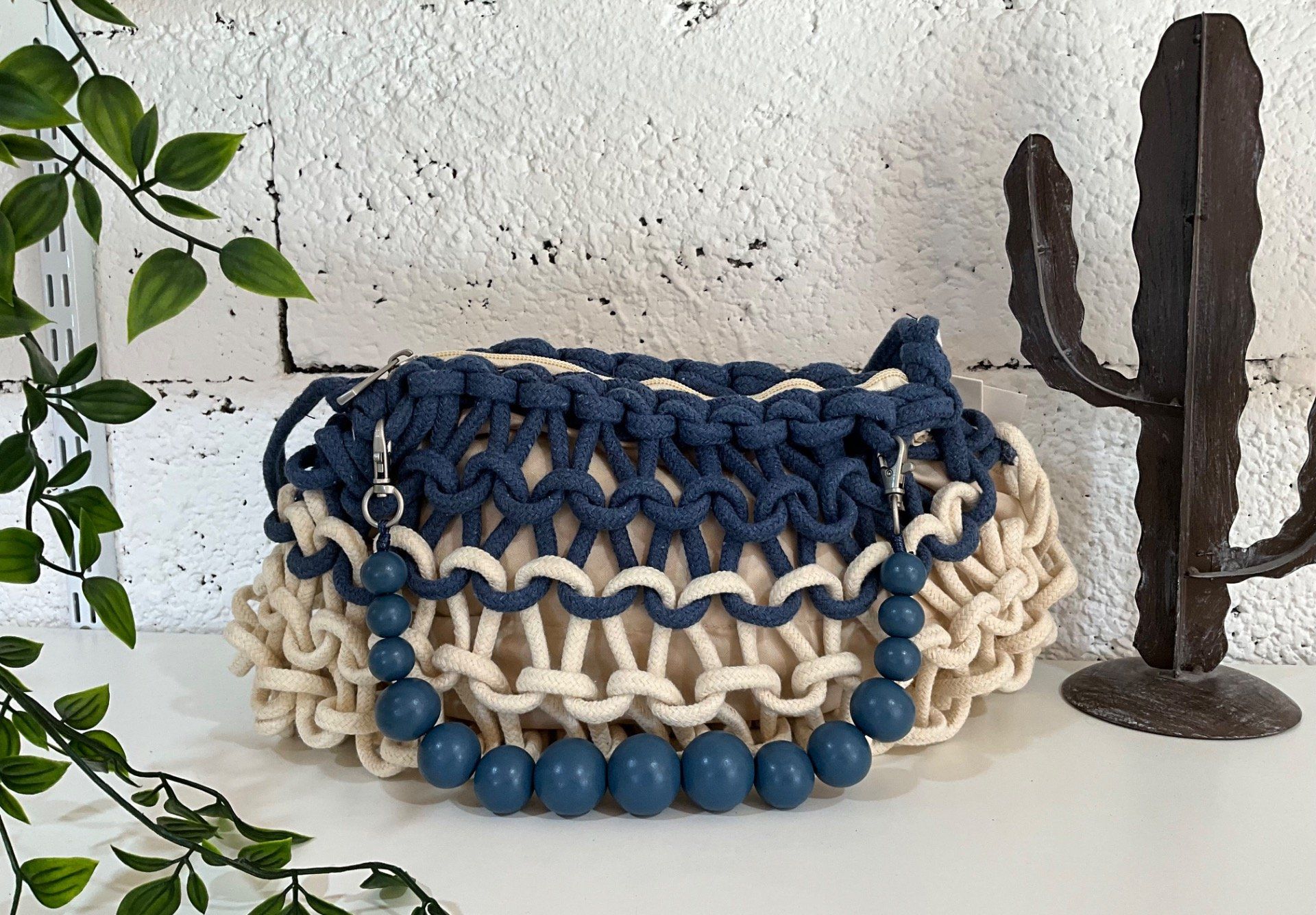 Sac macramé avec anse boules , fermeture zip , intérieur tissu avec plusieurs poches.