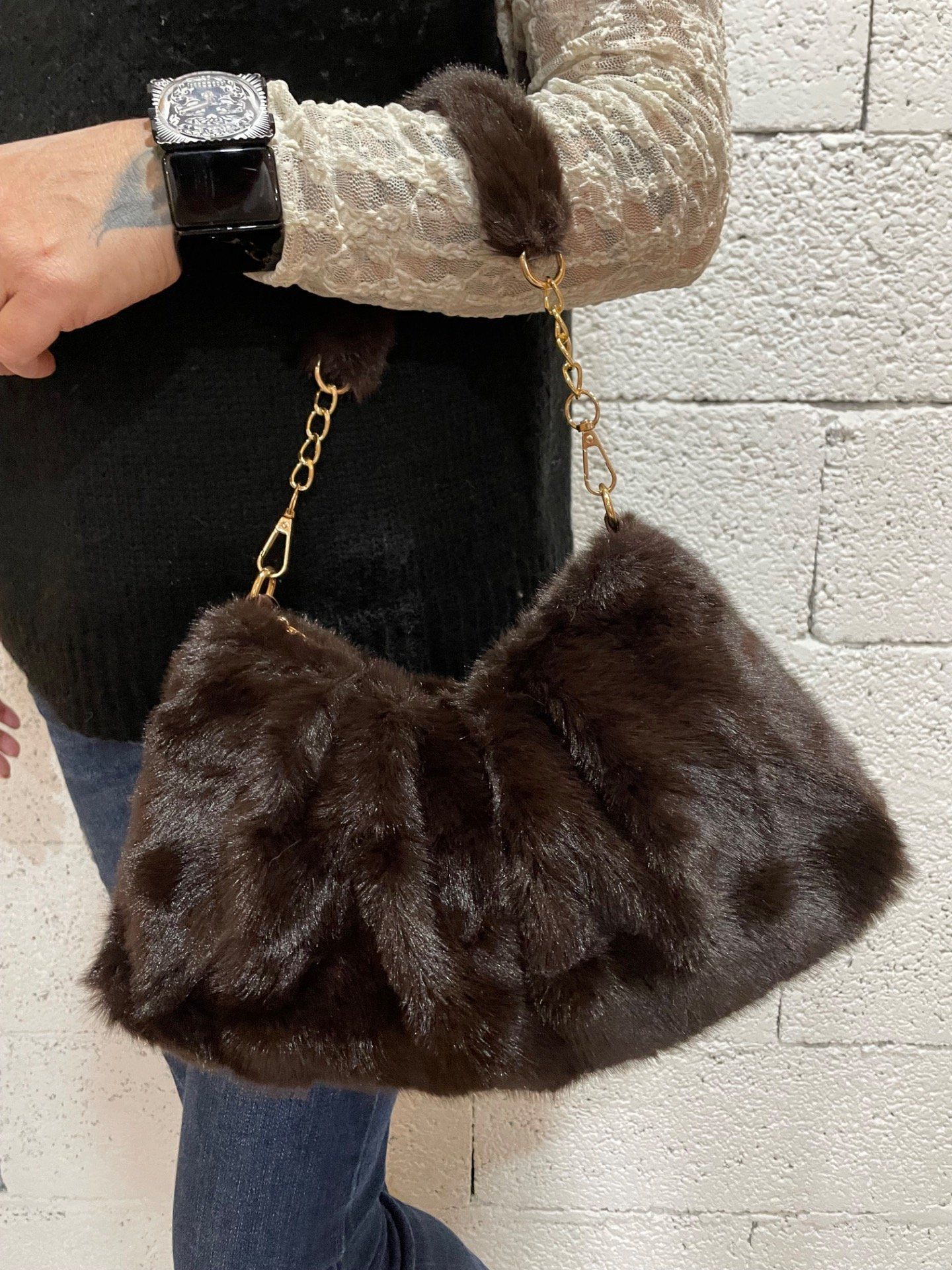 Sac fausse fourrure et chaîne dorée, poignée assortie en fourrure, intérieur doublé.