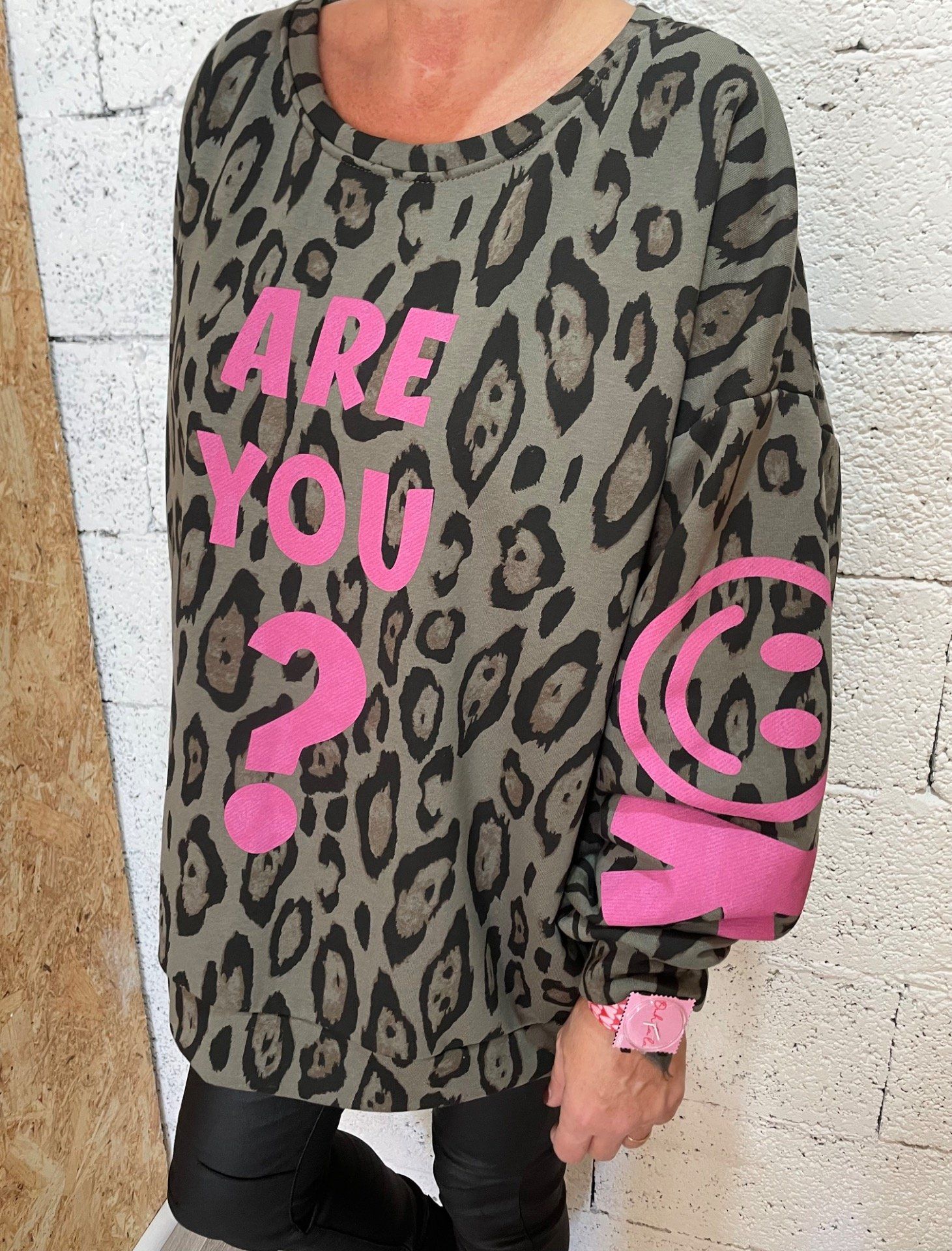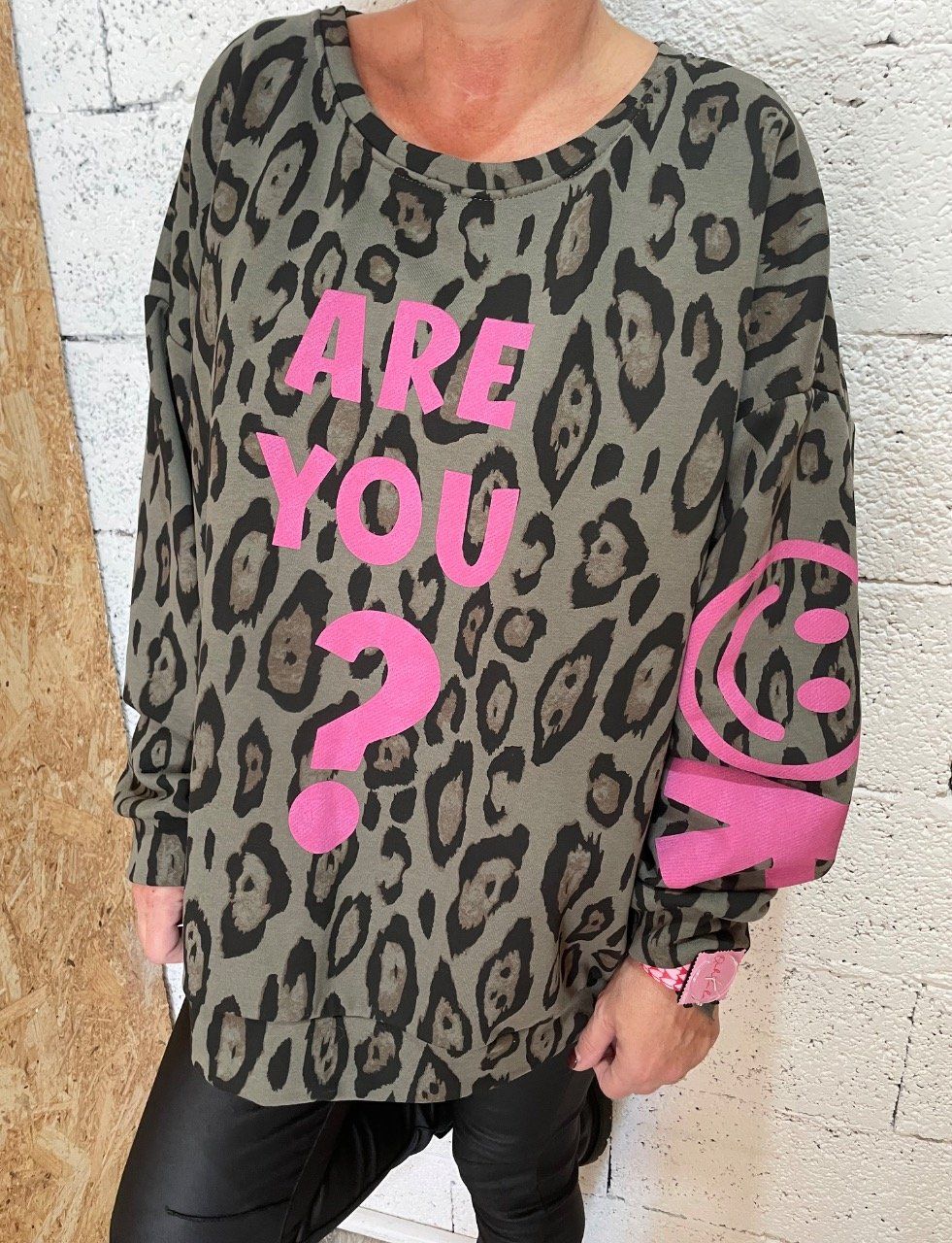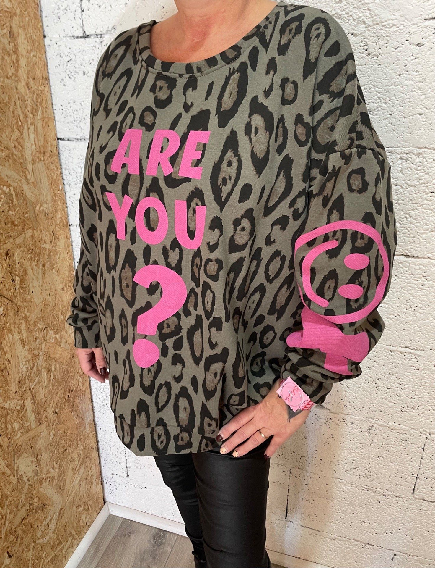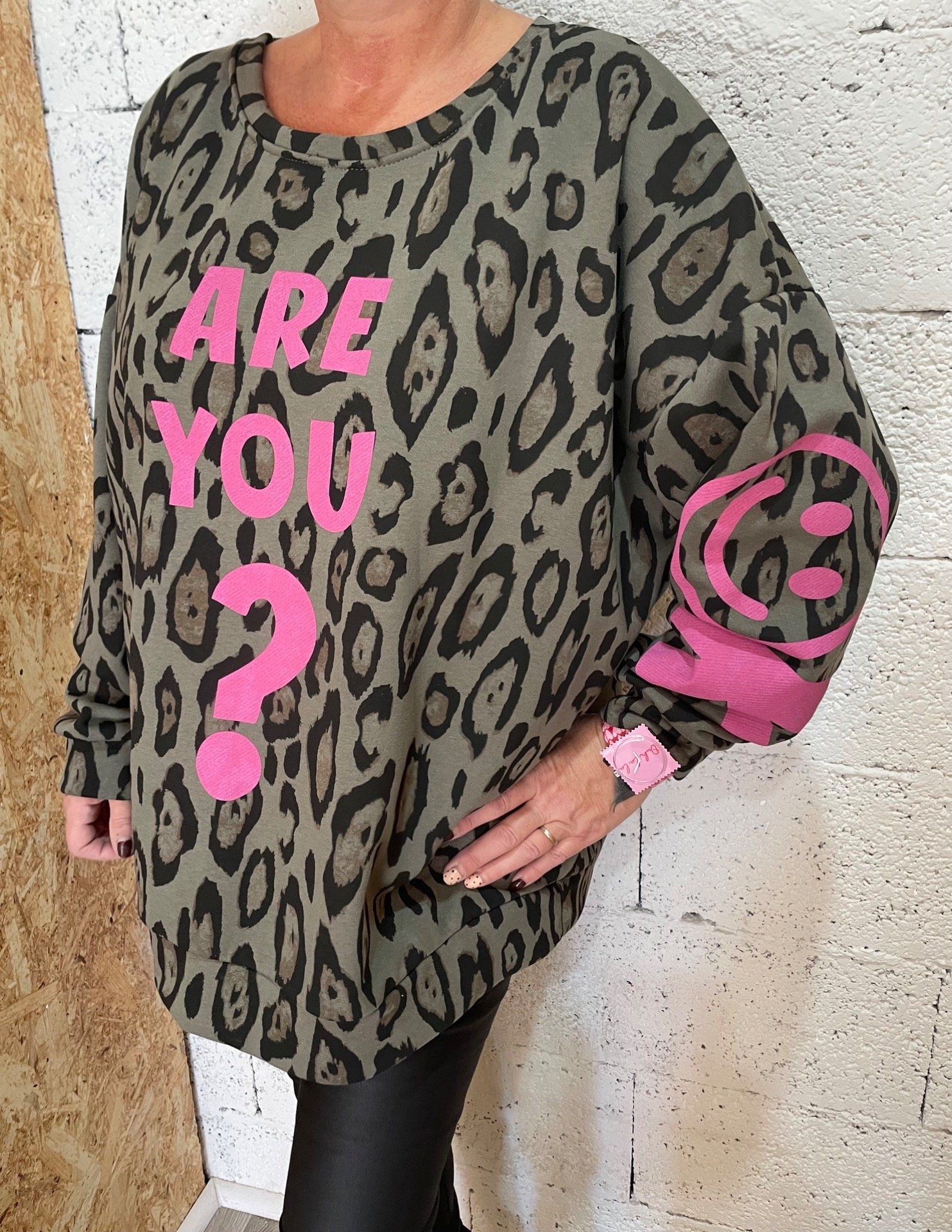 Sweat coupe oversize, col arrondi, motif léopard avec inscription rose .