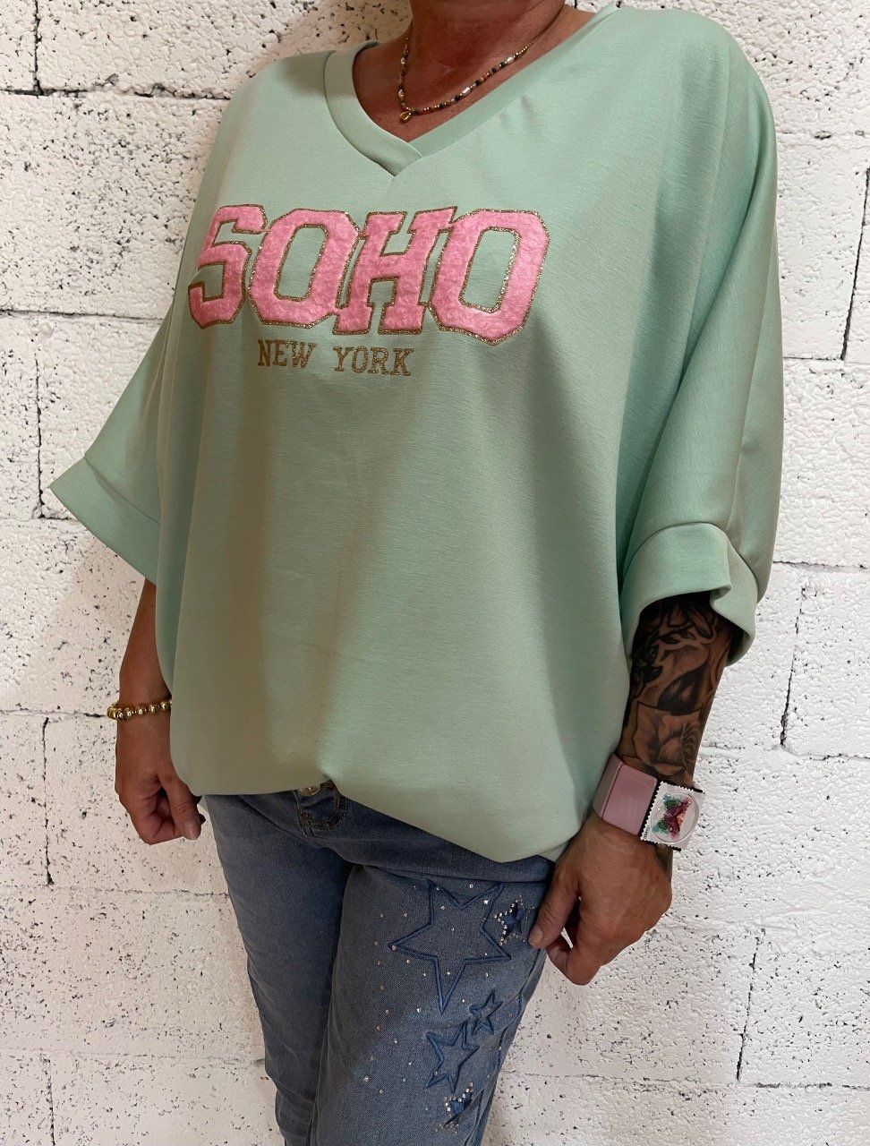Haut col en V , manches courtes , imprimé sur le devant, coupe large.