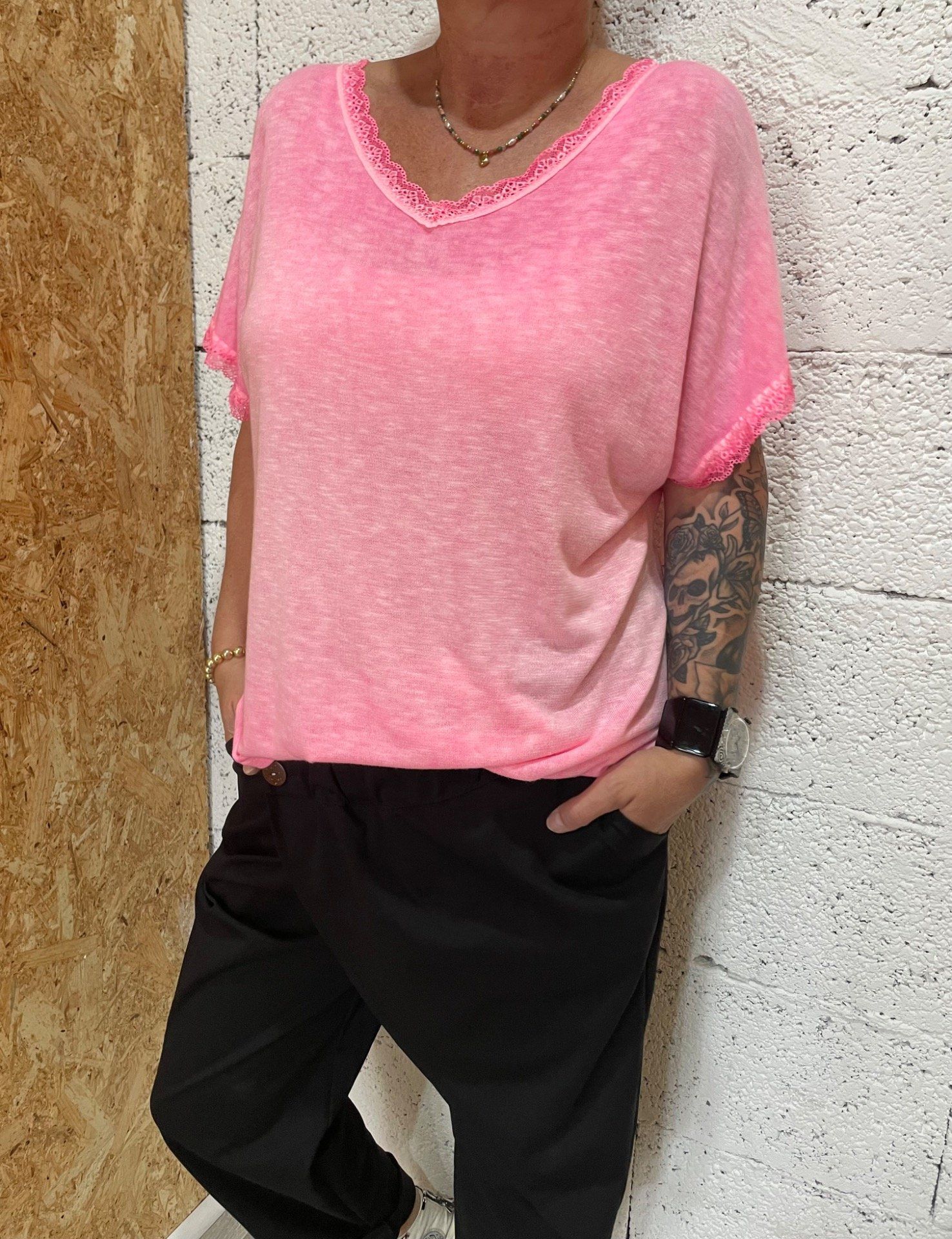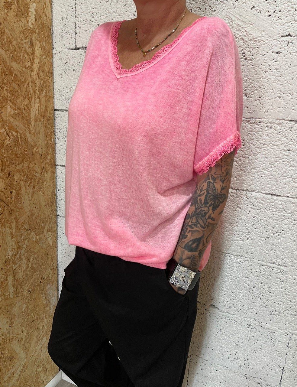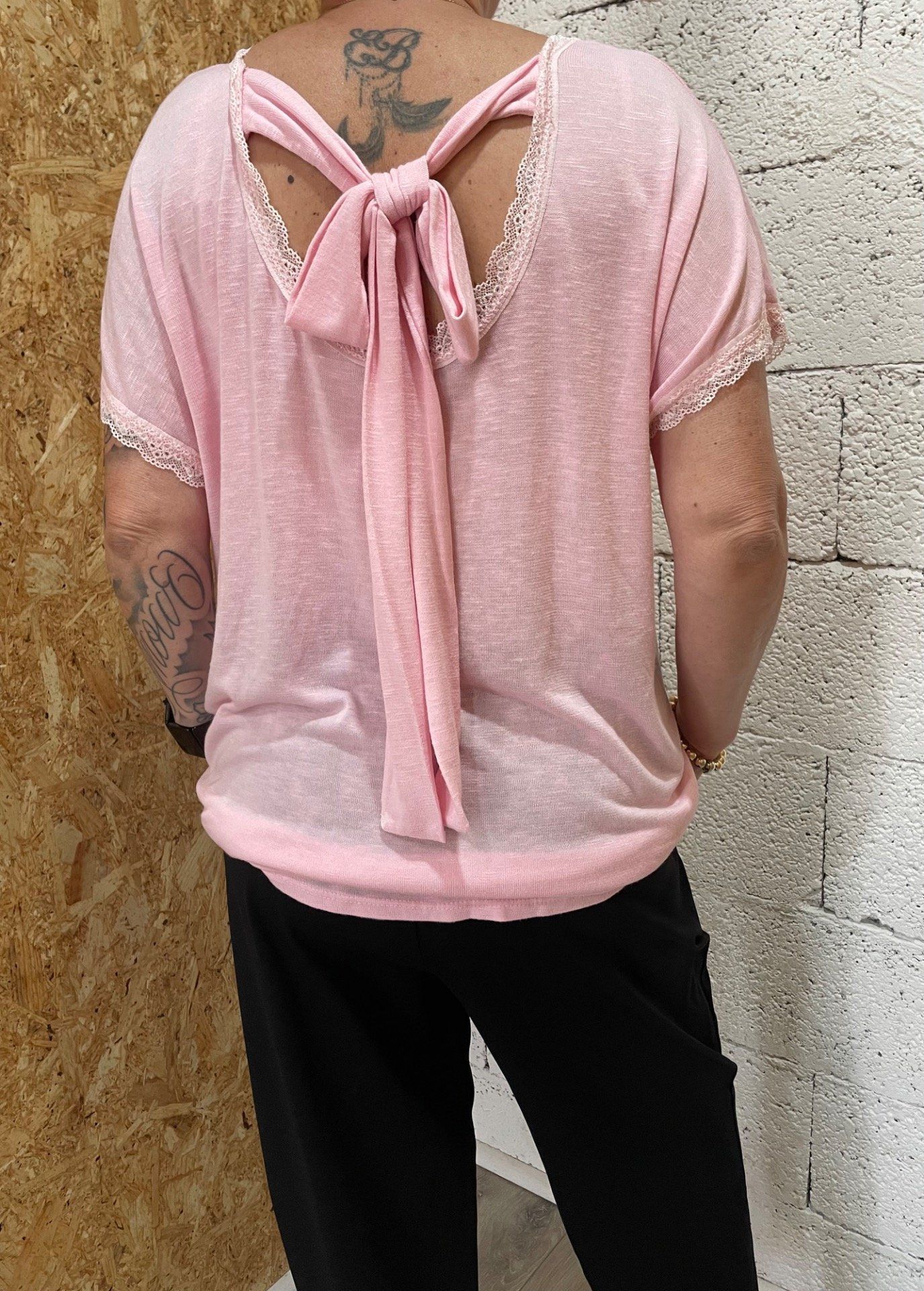 T-Shirt fluide , col en V avec dentelle, dos ouvert avec noeud décoratif , manches courtes finition dentelle.