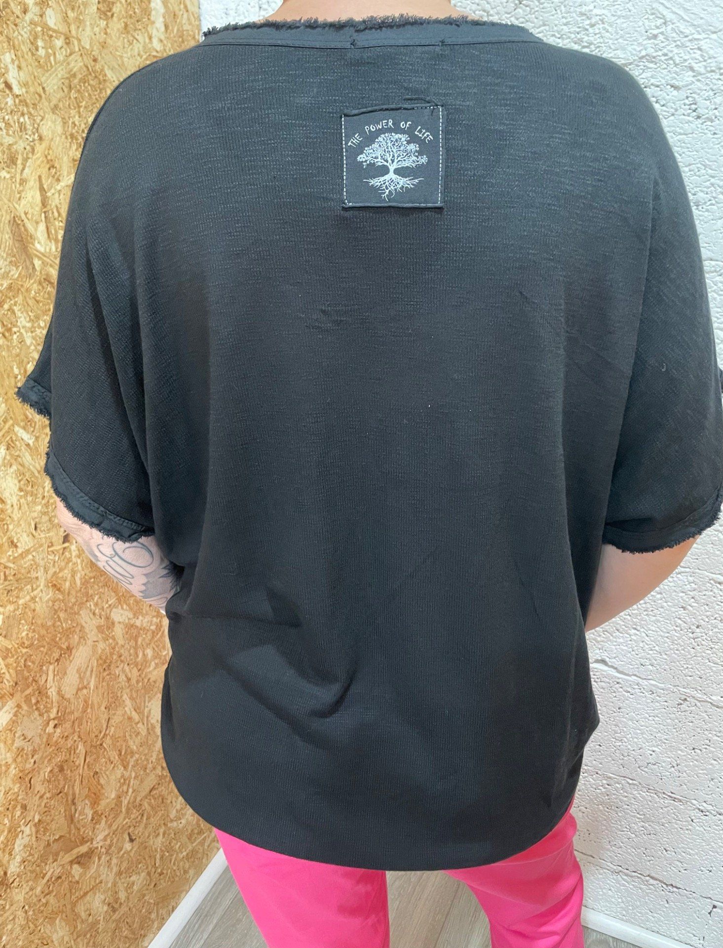 T-shirt col en V , coupe fluide , finition légèrement arrondie en bas .