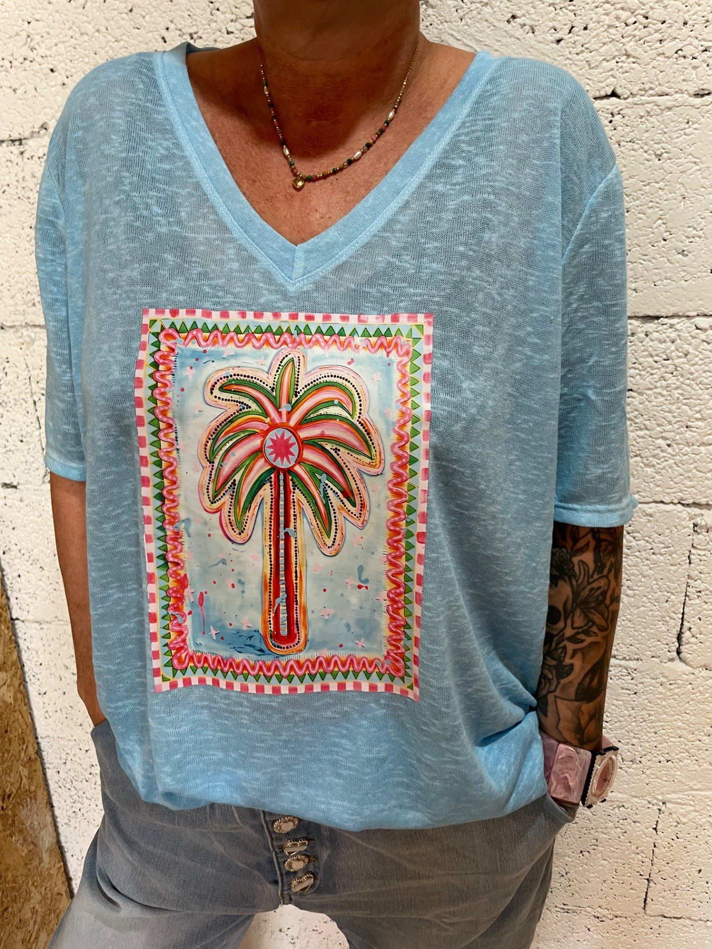 T-shirt col en V , motif tropical , tissu doux et léger.