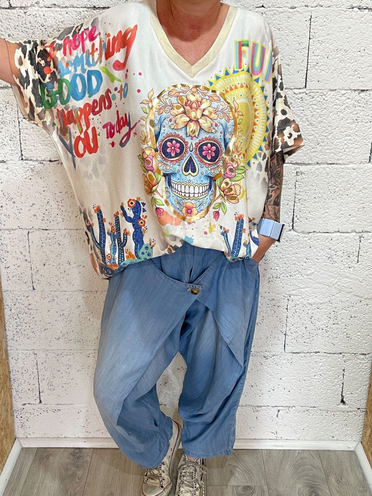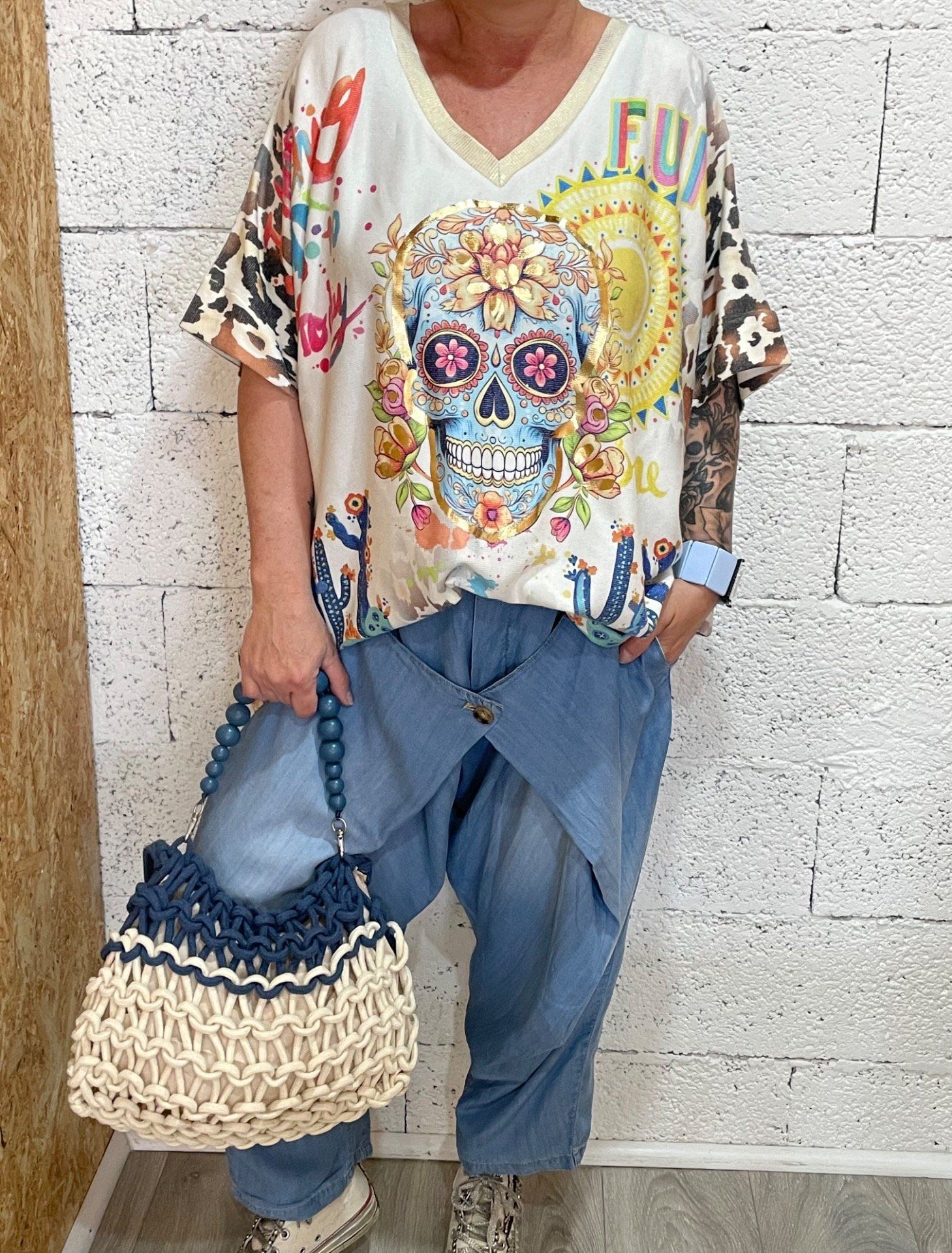 T-shirt lurex , col en V imprimé TDM mexicaine, coupe ample.