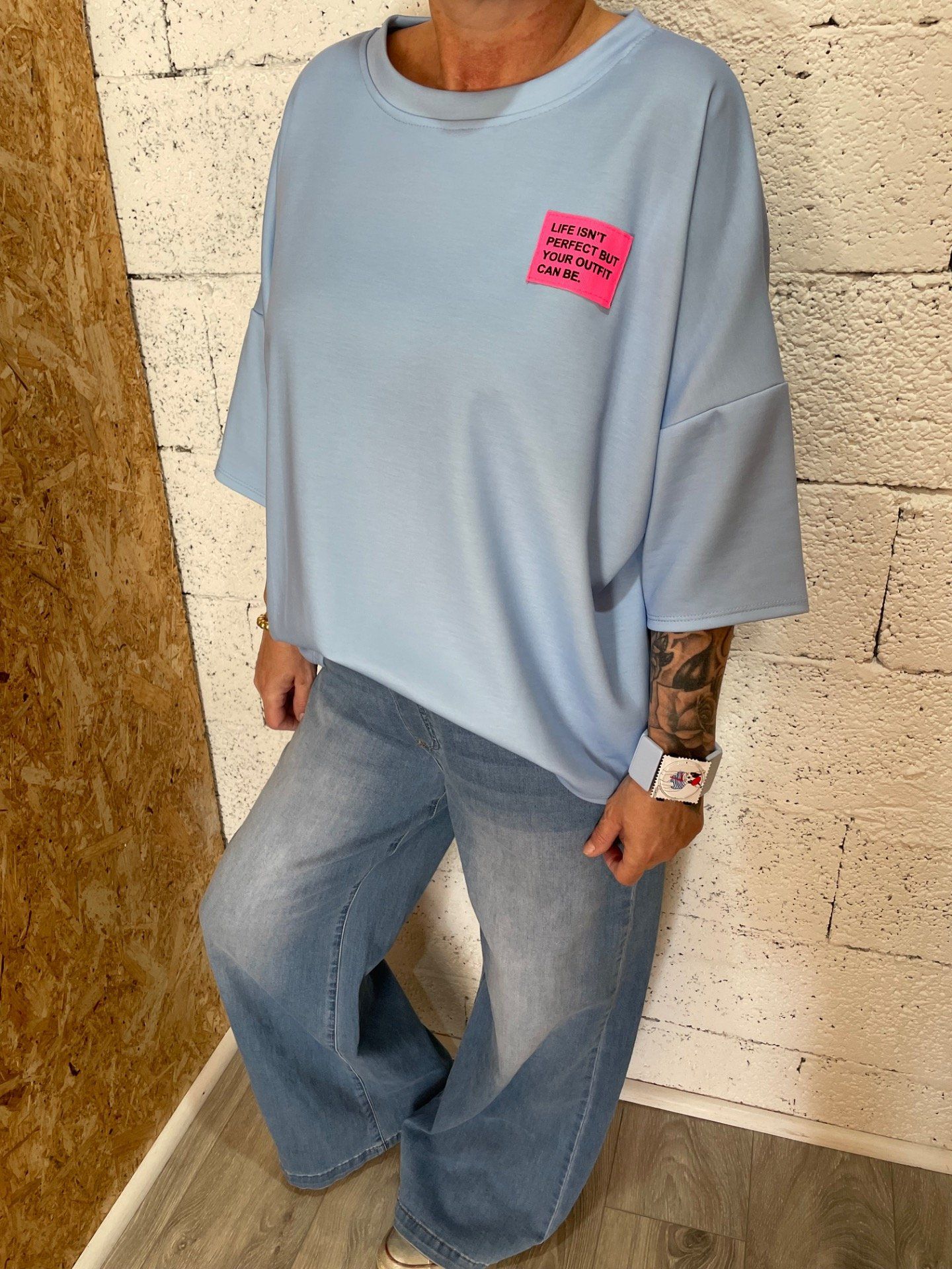 Haut manches courtes , col arrondi , écusson fluo , taille unique du 42 au 48.