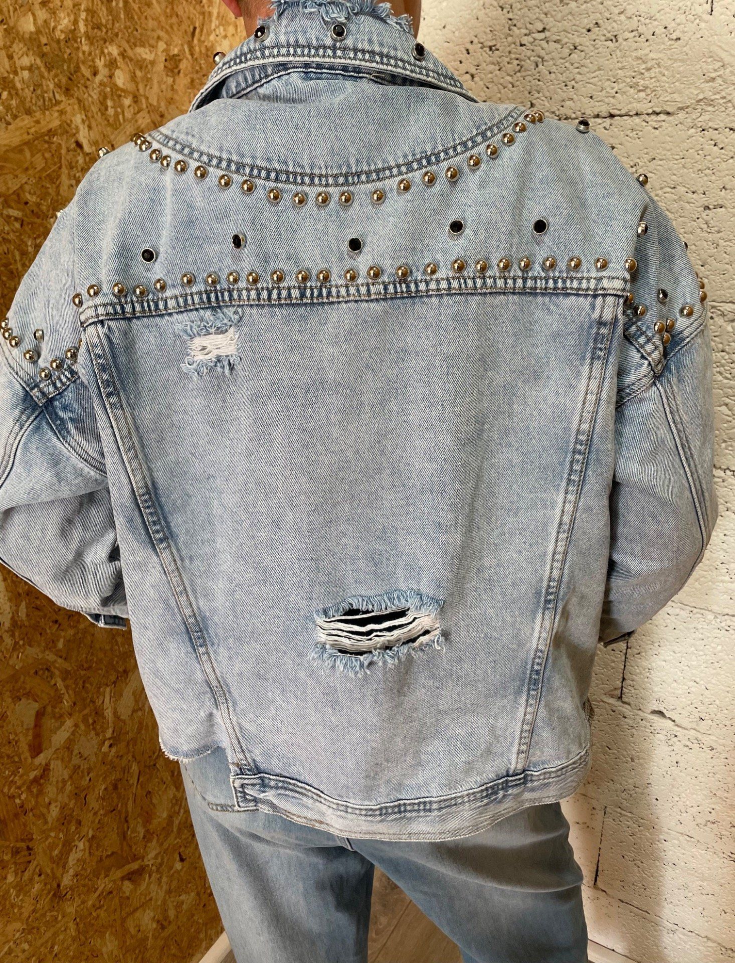 Veste en jean cloutée , fermeture boutons , deux poches poitrine.